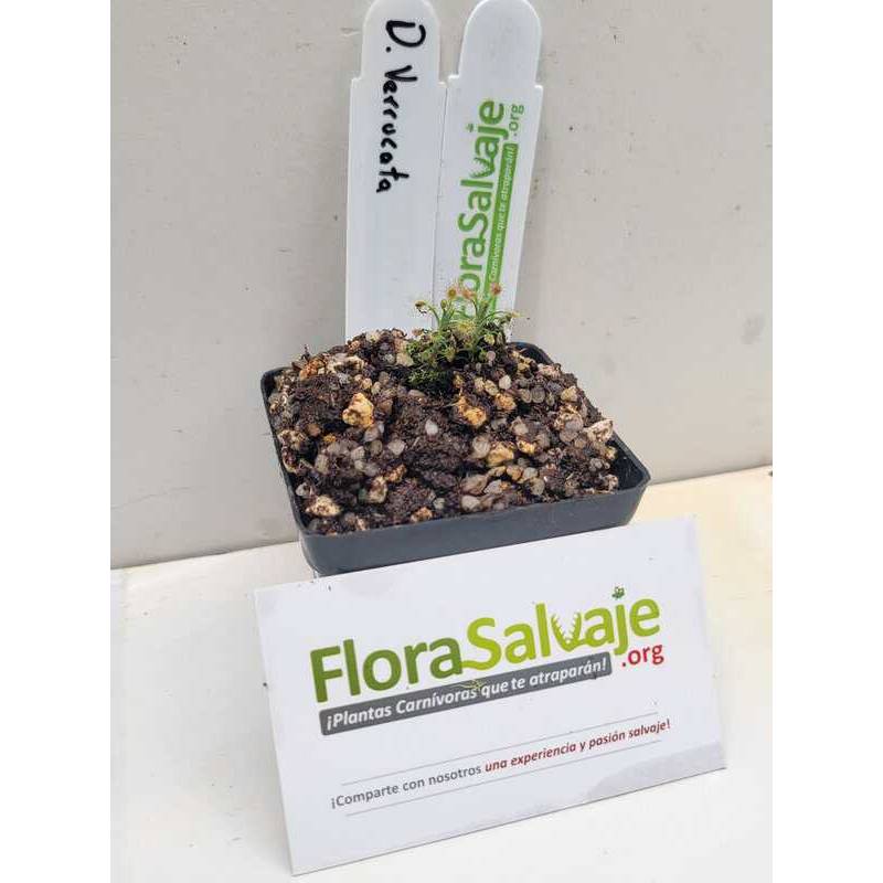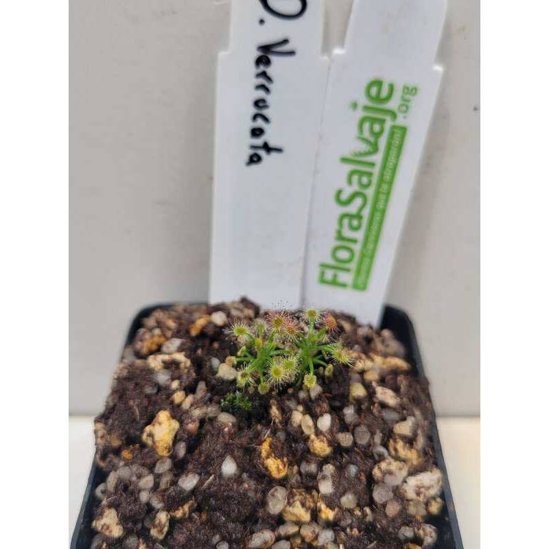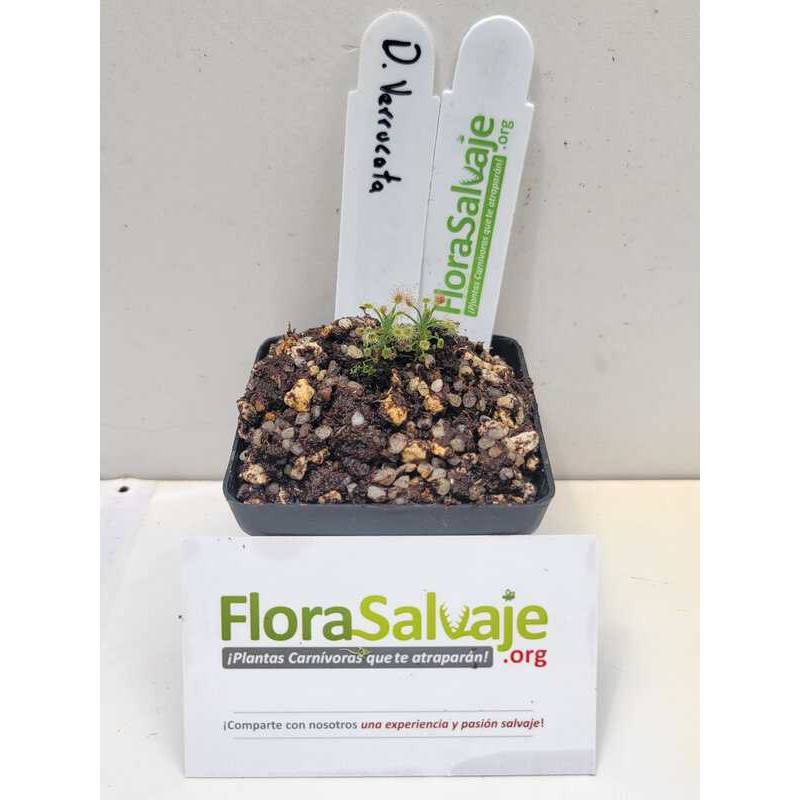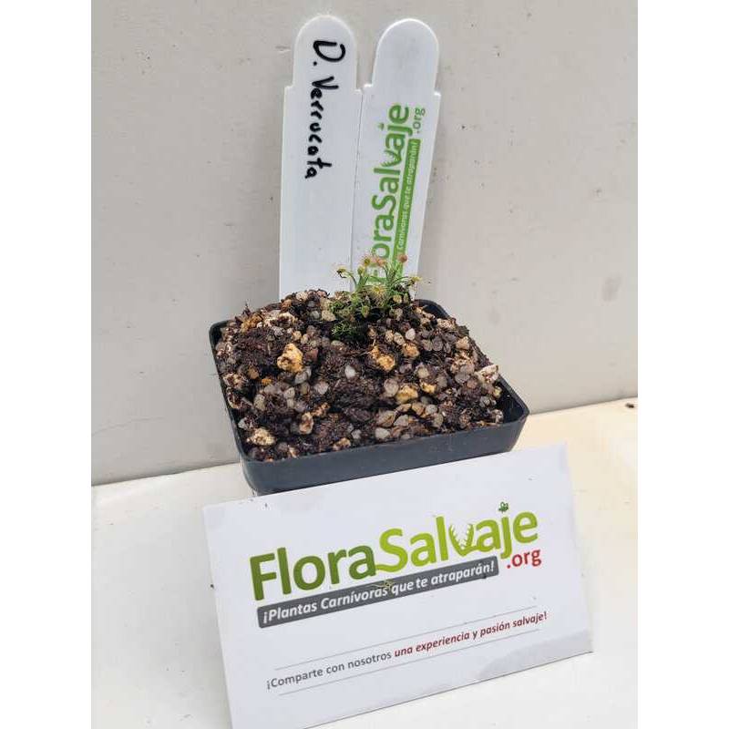 Descripción: Esta fascinante Drosera pigmea destaca por su crecimiento erecto y su tallo cubierto de proyecciones glandulares que le dan un aspecto "verrugoso" único (de ahí su nombre). Sus láminas foliares son orbiculares, sostenidas por pecíolos delgados que forman una roseta aérea muy elegante. Sus flores son de un vibrante tono anaranjado o metálico, elevándose sobre escapos florales finos. Como habitante de suelos arenosos, en cultivo exige un sustrato poroso (mezcla de arena y turba), luz intensa para resaltar sus tonos rojizos y un periodo de latencia estival seco, donde sobrevive mediante la formación de una estípula protectora.