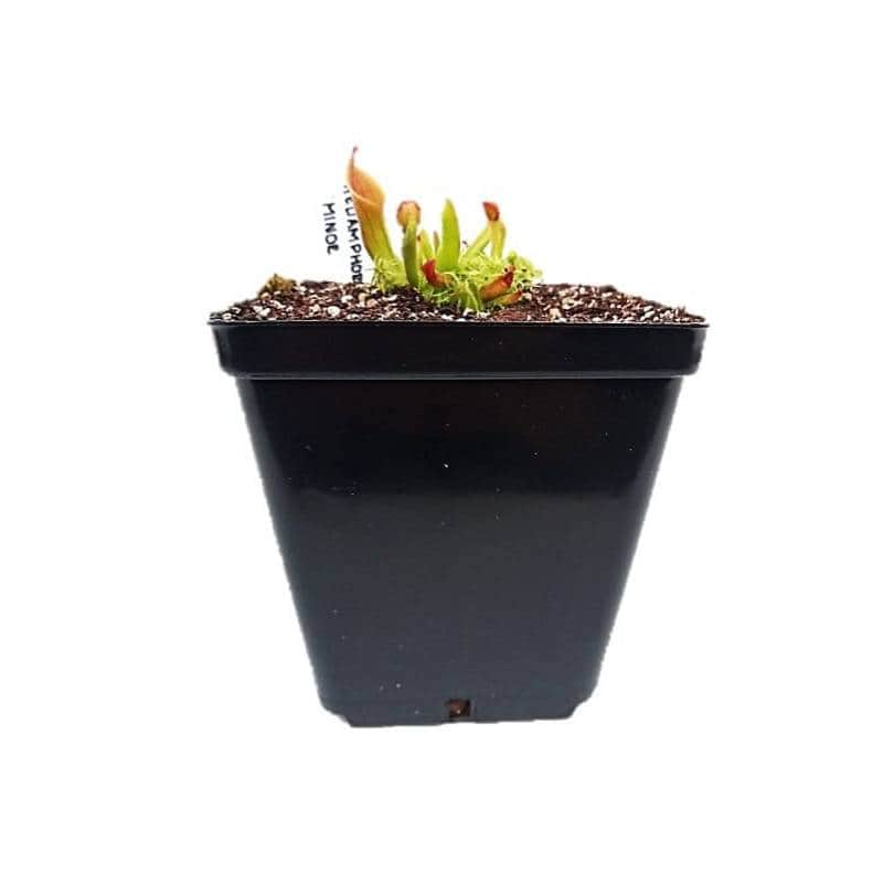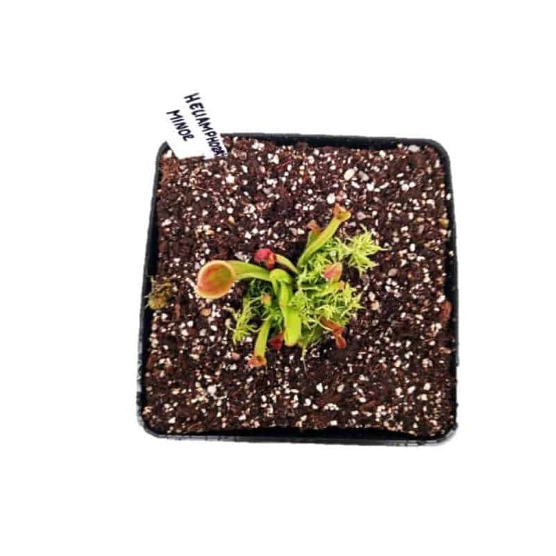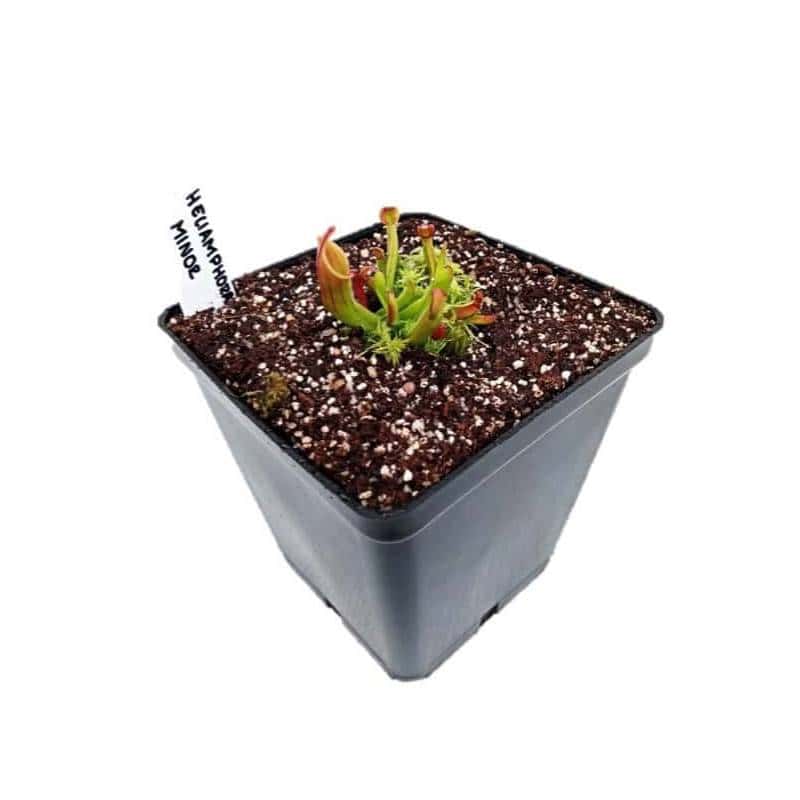 Descripción: Heliamphora minor (latín: minor = menor) es una especie de cántaro de marisma y es una de las especies más pequeñas del género. Presenta coloraciones verdes con tonos rojizos bajo buena iluminación. Requiere alta humedad, excelente ventilación y luz brillante sin sol directo intenso.