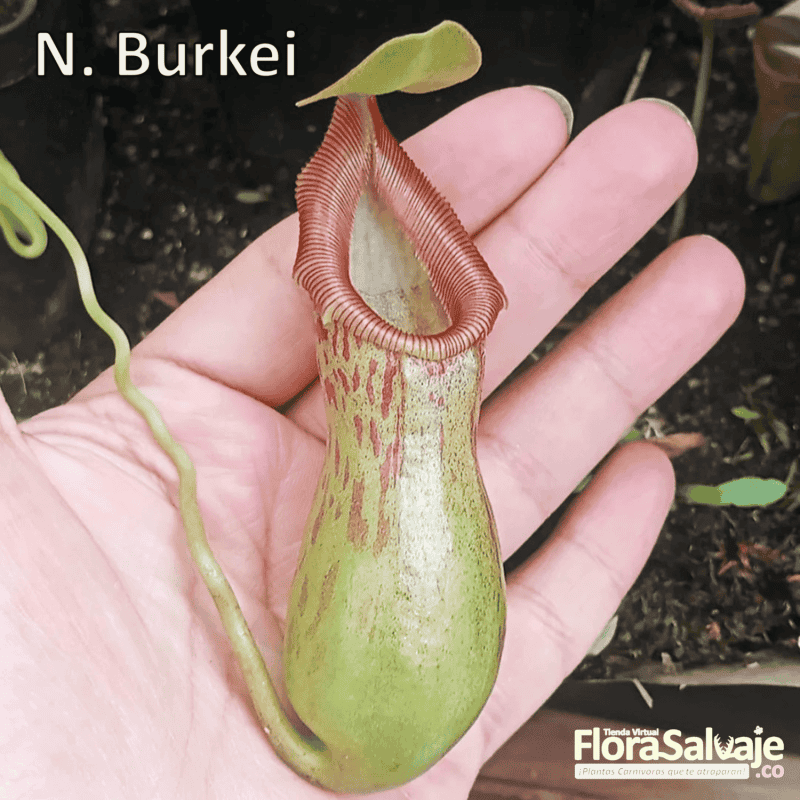 Descripción: Nepenthes burkei es una planta de jarra tropical originaria de Filipinas donde crece a alturas entre 1100 a 2000 msnm. Es el nombre del recolector de plantas británico, David Burke. Los cántaros se ven pintados: un peristoma rojo sangre corona el cuerpo, que está decorado con rayas rojas que contrastan con un fondo verde amarillento.