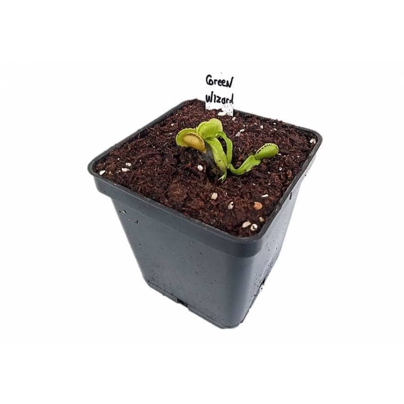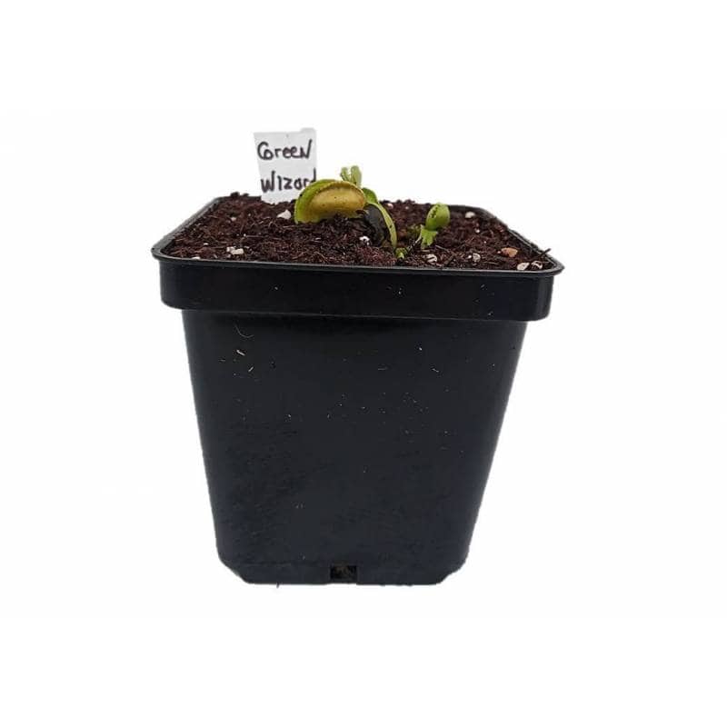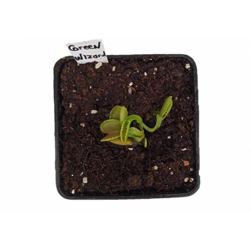 La dionaea "Green wizard" ha evolucionado a partir de una mutación espontánea. Los dientes de las hojas totalmente verdes y atrapantes son notablemente pequeños y cortos. Debido a esto, parece que el "mago verde" de Dionaea muscipula no puede hacer mucho daño, ¡pero las apariencias engañan! Las trampas atractivas que se cierran rápidamente de las que crecen estos dientes puntiagudos son en el exterior verde amarillento y en el interior rojo pálido.