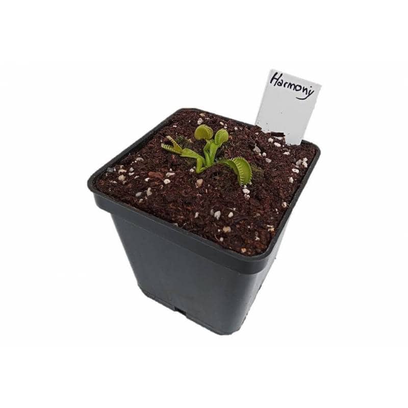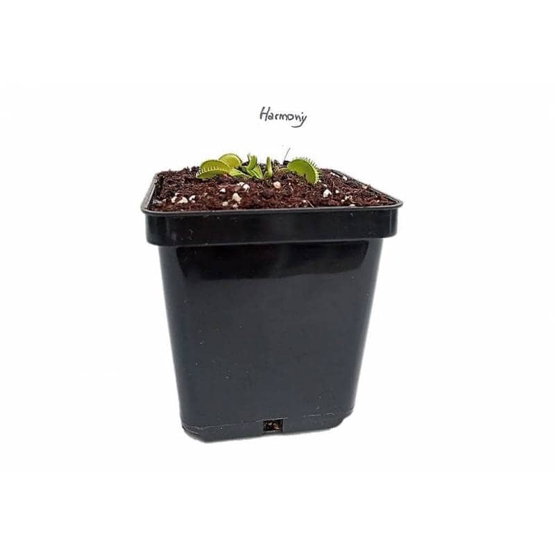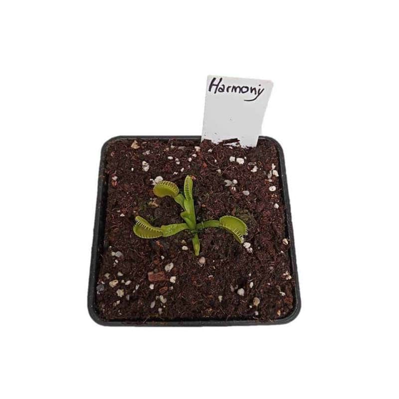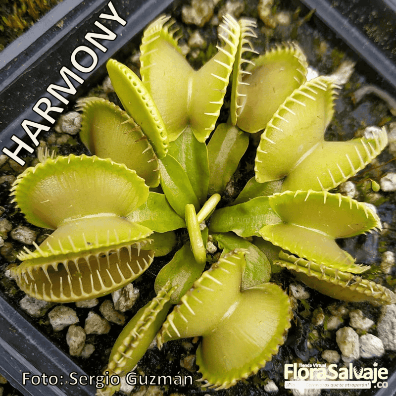 Dionaea muscipula 'Harmony', es una llamativa planta de color verde / amarillo brillante. Sus trampas y hojas gruesas, casi cerosas, le dan una apariencia de otro mundo, casi de la era espacial. Produce trampas grandes con dientes con punta de púas realmente frescos y únicos cuando madura. 'Harmony' produce y postra (abrazándose al suelo) trampas durante toda la temporada. Es un cultivador vigoroso.