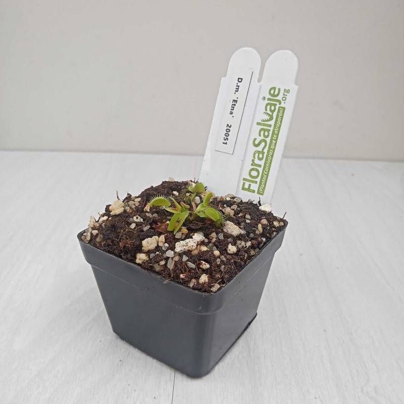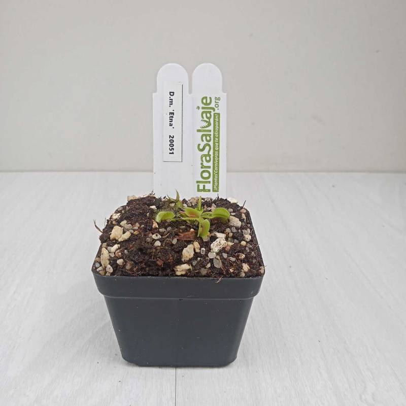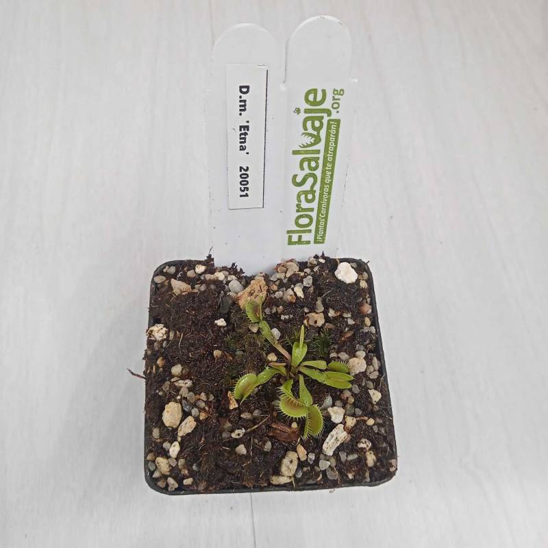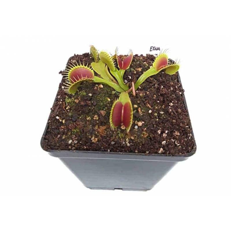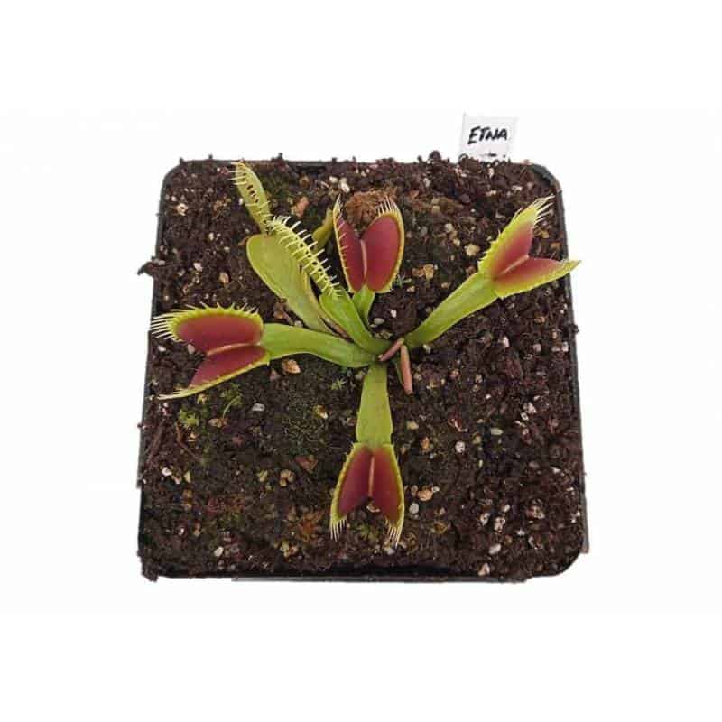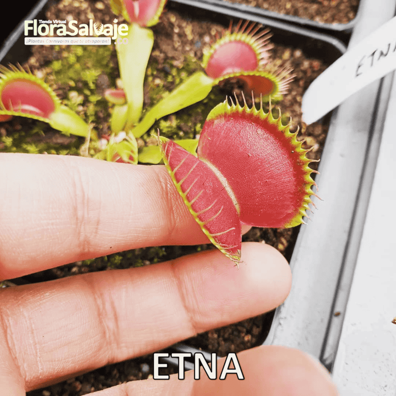 La Dionaea muscipula 'Etna' es un cultivar impresionante que destaca por el gran tamaño de sus trampas, que pueden alcanzar en promedio entre 4 y 5 centímetros de largo. Sus trampas son anchas, con lóbulos robustos y dientes marginales bien definidos, lo que le da una apariencia poderosa y dominante. Bajo buena iluminación, desarrolla una intensa coloración rojiza en el interior de las trampas, contrastando con el verde brillante del exterior. Es una variedad muy apreciada por su vigor, tamaño y fuerte presencia visual.